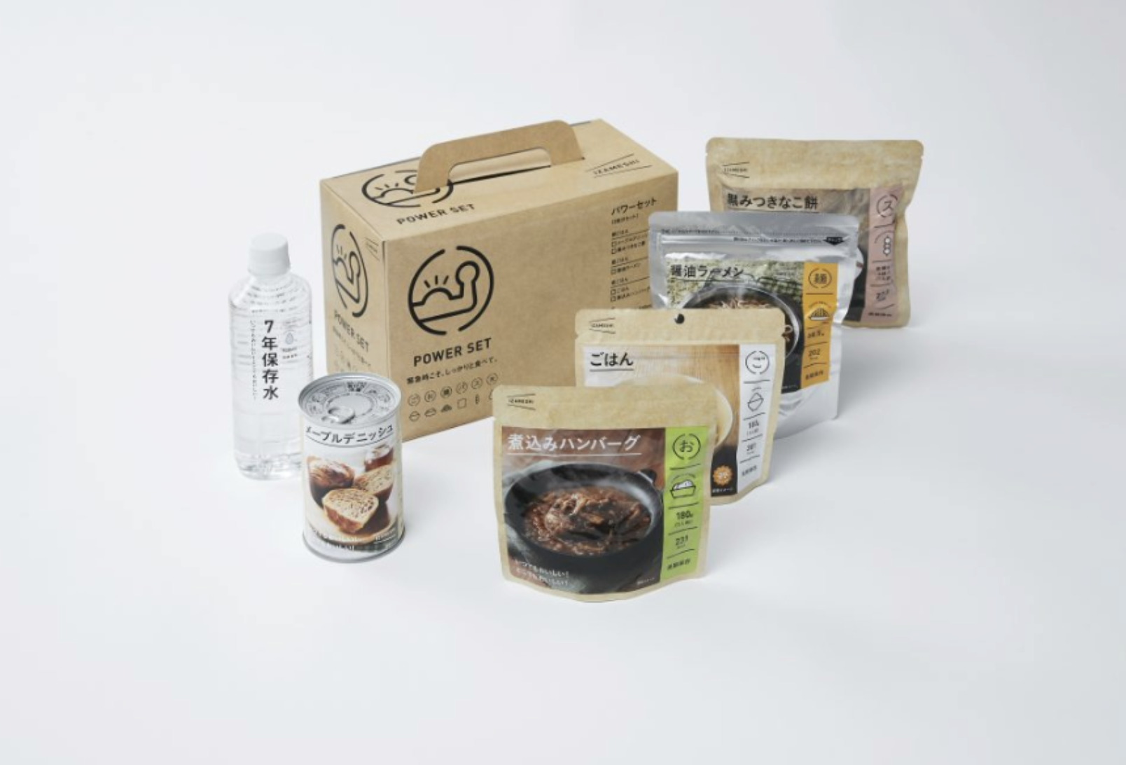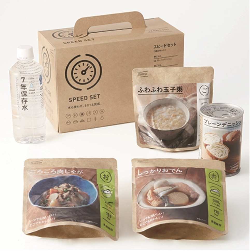 【ヘルシーセット】まんぞく豚汁/おだしじんわりきつねうどん/五目ご飯/ぶり大根/7年保存水500ml【スピードセット】プレーンデニッシュ/しっかりおでん/ふわふわ玉子粥/ごろごろ肉じゃが/7年保存水500ml【パワーセット】ごはん/メープルデニッシュ/煮込みハンバーグ/もちもちお餅のちからうどん×1/黒みつきなこ餅/7年保存水500ml